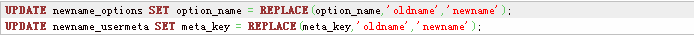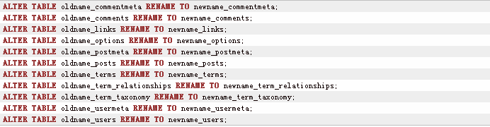 其中,oldname替换为你旧的数据表前缀 ,newname替换为你要改成的新数据表前缀。