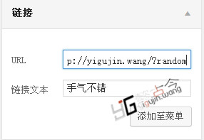 第二步,在WordPress后台》外观》菜单中添加一个链接类型的菜单,在URL中输入:http://yigujin.wang/?random(记得把本站域名改为贵站域名哦),在链接文本中输入:手气不错(或其他)。