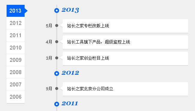 <div class="box"> <ul class="event_year"> <li class="current"><label for="2013">2013</label></li> <li><label for="2012">2012</label></li> <li><label for="2011">2011</label></li> </ul> <ul class="event_list"> <div> <h3 id="2013">2013</h3> <li><span>5月</span><p><span>站长之家专栏改版上线</span></p> </li> <li><span>4月</span><p><span>站长工具旗下产品,超级监控上线</span></p> </li> <li><span>3月</span><p><span>站长之家创业栏目上线</span></p> </li> </div> <div> <h3 id="2012">2012</h3> <li><span>9月</span><p><span>站长之家北京分公司成立</span></p> </li> </div> </ul> </div>
