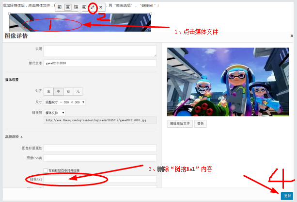 在添加好媒体后,点击媒体文件,在弹出的菜单中,选择“编辑”,再“高级选项”,“链接rel ”删除其中的内容,“更新”