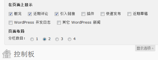 登陆进入WordPress后台,首先进入的一般是"控制板"这个页面,这里显示了博客的概况、近期评论、引入链接、快速发布、WordPress 开发日志等等,这个页面可以整体的显示博客的一些信息,也提供了一些小的功能。其实WordPress提供这么多的面板,有很多我们是用不着的,如"其它 WordPress 新闻","WordPress 开发日志"等,而且不同用户还有不同的喜好,这时候我们可以将不需要的面板删除,方法很简单,在控制板页面右上角有个 "显示选项" 按钮,点击可以弹出如下图所示的选项,你可以根据需要去除不需要的模块。