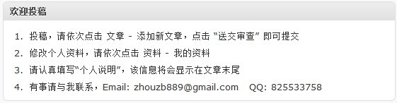echo "<p><ol><li>投稿,请依次点击 文章 - 添加新文章,点击 “送交审查” 即可提交</li><li>修改个人资料,请依次点击 资料 - 我的资料</li><li>请认真填写“个人说明”,该信息将会显示在文章末尾</li><li>有事请与我联系,Email: zhouzb889##gmail.com QQ: 825533758</li></ol></p>";
