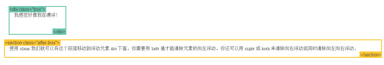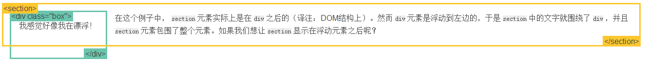 在这个例子中, section 元素实际上是在 div 之后的(译注:DOM结构上)。然而 div 元素是浮动到左边的,于是 section 中的文字就围绕了 div ,并且section 元素包围了整个元素。如果我们想让 section 显示在浮动元素之后呢?