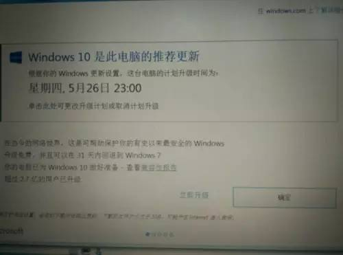你看,有中国用户最近就发现,在 Windows 7、8操作系统上遭遇的 Windows 10 定时更新的弹窗。这弹窗格外霸道:除了立即升级、今晚升级和选择升级时间以外,根本就没“不更新”可选!