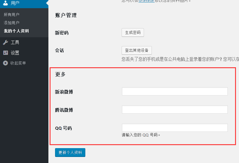 WordPress 自带的个人资料字段在中国用的比较少,而我们常用的却没有,如果你想在 WordPress 个人资料页面创建额外的自带可以参考本文。