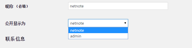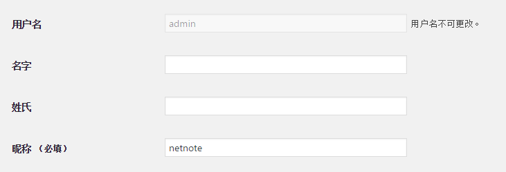 接着我们在个人资料中修改昵称为其他名称,如下图,用户 admin的昵称改为了netnote,这样一来,作者存档的链接就自动由 http://域名/author/admin 变成了 http://域名/author/netnote。