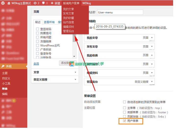 2、然后我们要调用的是 user-menu (用户菜单)这个菜单位置的菜单,就可以使用下面的代码: