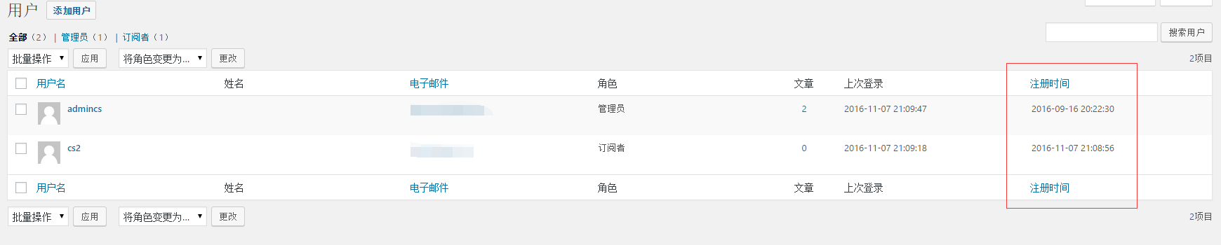 WordPress后台的用户列表默认是没有显示用户注册时间的,如果你要添加这个功能,将下面的代码添加到当前主题的 functions.php 文件即可。