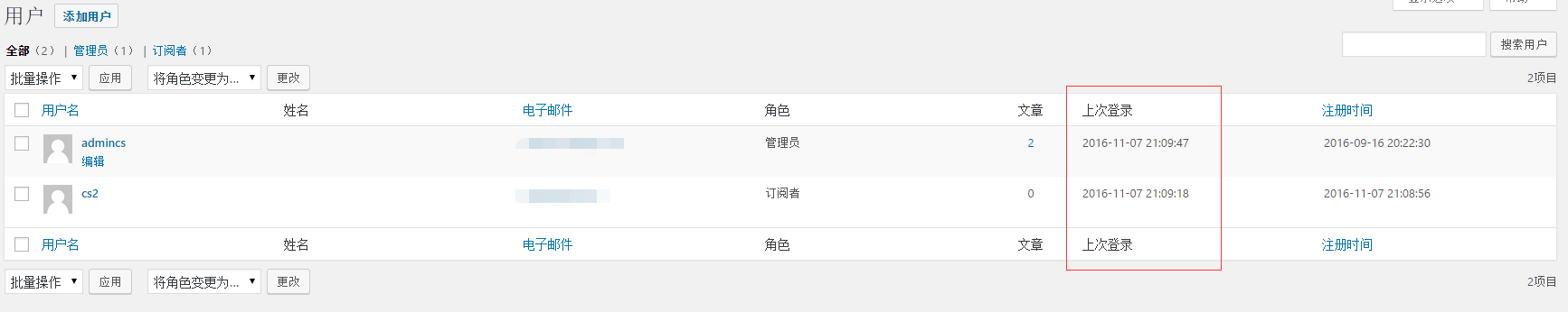 对于WordPress多用户站点,了解用户的活跃程度是很必要的。在 WordPress 后台用户列表显示用户最后一次登录的时间,可以比较直观地知道用户的活跃度。