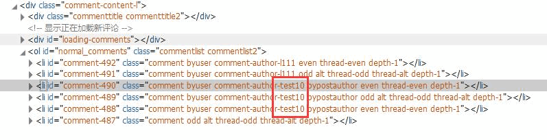 // comment_class()过滤后的结果如下,去掉了原有class里的comment-author-test10,请和上面的图1比较 class="comment byuser bypostauthor odd alt thread-odd thread-alt depth-1" // body_class()过滤后的结果如下,去掉了原有class里的author-test10和author-1,请和上面的图2比较 class="archive author logged-in"