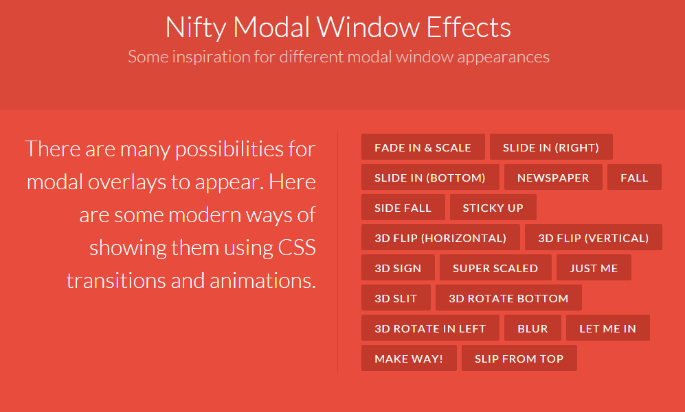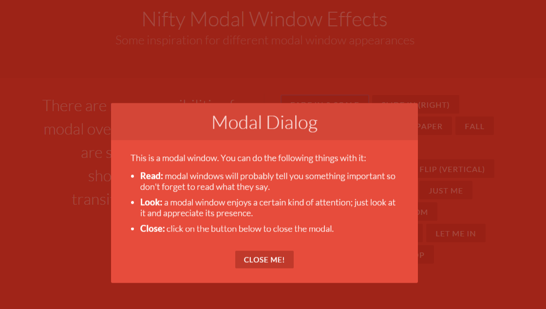 19种漂亮的CSS弹出窗效果 div+css2017年1月21日 网页设计中弹出窗一般用于简短的文字介绍,是十分常用的一个代码。通过CSS3动画样式,我们可以实现不同交互的弹出框。 下面这个DEMO演试有19种不同动画效果的弹出窗,如向上、向左、右、全屏、渐变展示等等。 在线演试 代码下载