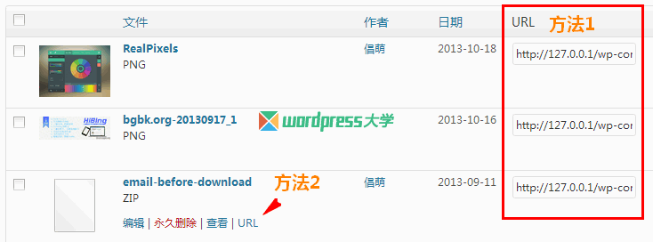 有时候我们需要进入 WordPress 的媒体库复制某个文件的链接地址,但是默认情况下,必须进入查看页面,或者编辑界面,才可以弄到文件的链接地址,非常不方便。下面分享两种方法,效果如图: