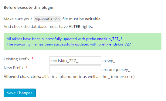 修改成功后,插件的使命结束,可以直接停用并卸载。如果修改失败,一般是因为两个原因。一是没有给足当前数据库用户足够的操作权限;二是 WordPress 根目录的 wp-config.php 文件没有写入权限,自己排查一下吧。