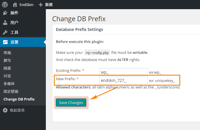 要想轻松的修改数据库表前缀,首先需要安装并启用 Change DB Prefix 插件,然后进入后台的“设置”→“Change DB Prefix”。