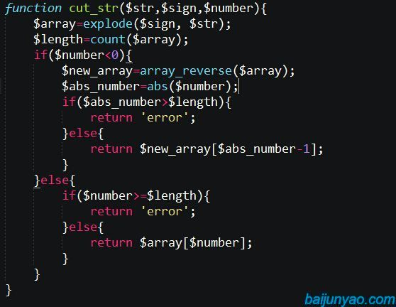 echo cut_str($str,'/',0); //输出 123 echo cut_str($str,'/',2); //输出 789 echo cut_str($str,'/',-1);//输出 abc echo cut_str($str,'/',-3);//输出 456