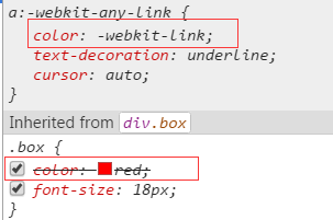 按理说颜色是可以继承的,那么为什么a标签的颜色没有变成红色呢?审查一下元素,如图1.3所示。