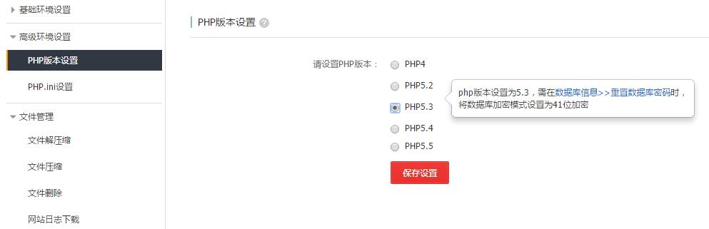登陆万网(阿里云)虚拟主机管理页面-“高级环境设置”-“PHP版本设置”,修改PHP版本为5.3或以上版本。