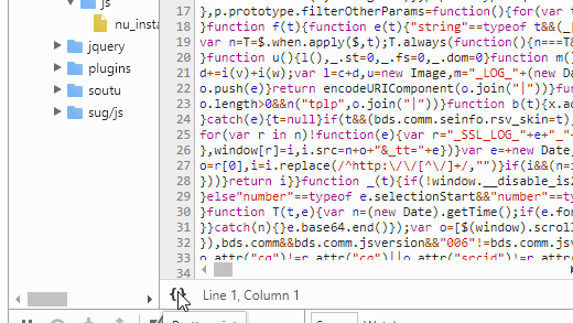 有些时候,我们在控制台的Sources中查看CSS或JavaScript文件时,会看到一堆压缩的代码,但只需点击一下这里: