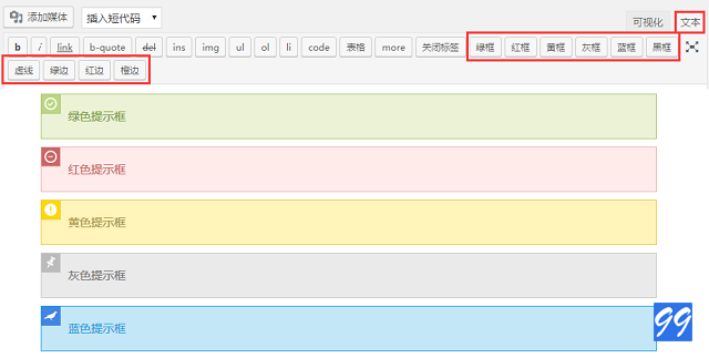 看到很多博客都在用这个美化框,感觉不错,九哥也用上了,自己拓展了一下,增加了几个,并在后台文章文本编辑器添加了自定义快捷标签按钮。WP自带的摘要也太素了,而且看着感觉不清楚。有需要的朋友也可以拿去试试。