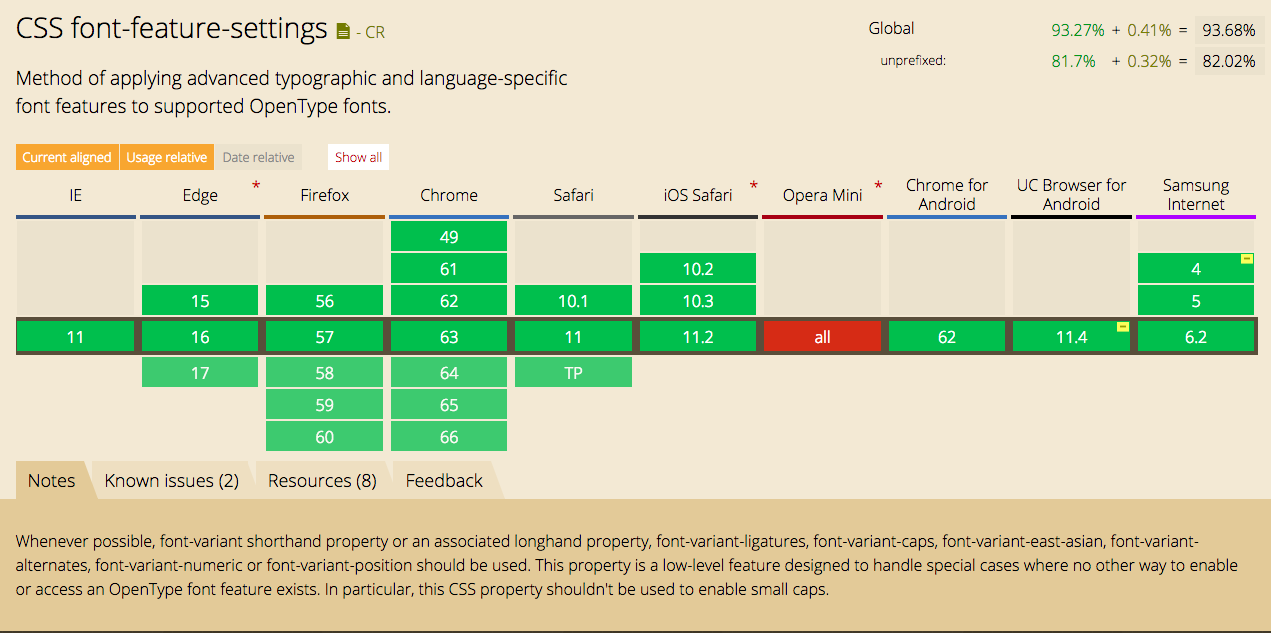 可以看出font-feature-settings的主流浏览器兼容支持比较好,所以使用时优先利用该特性。