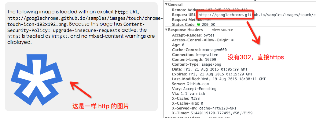 我们的页面是 https 的,而这个页面中包含了大量的 http 资源(图片、iframe等),页面一旦发现存在上述响应头,会在加载 http 资源时自动替换成 https 请求。可以查看 google 提供的一个 demo: