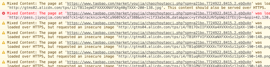 Mixed Content: The page at ‘https://www.taobao.com/‘ was loaded over HTTPS, but requested an insecure image ‘http://g.alicdn.com/s.gif’. This content should also be served over HTTPS.