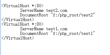 而基此,我又发现了另一个问题:在配置多站点的时候,我将虚拟主机配置中的localhost的server名改为test1.com,并添加了一个test2.com的虚拟主机,如图: