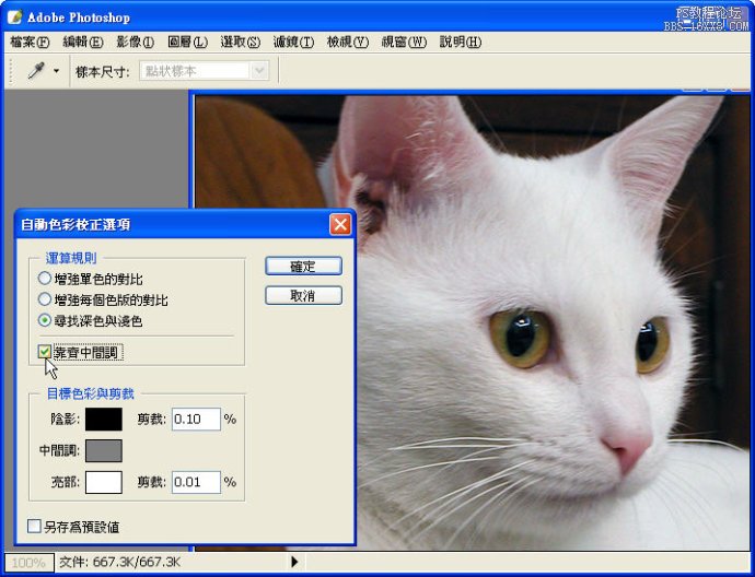 在使用 「尋找深色與淺色」就是「自動色彩」 時,可以同時鉤選「靠齊中間調」 就會平均在RGB三個色板中尋找最靠近中間調 128灰的點,達到色彩校正的效果~
