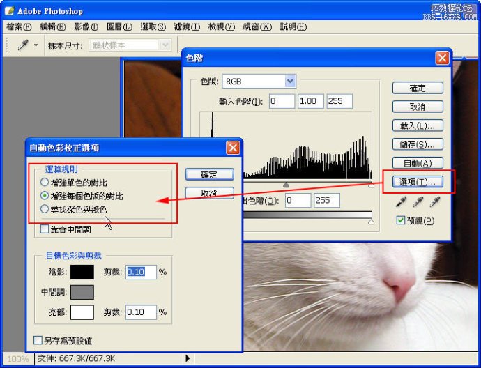 先打開「色階」或「曲線」,然後點選面板上的「選項」按鈕,就可以開啟「自動色彩校正選項」~