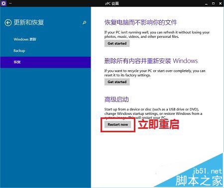 第三步、在更新和恢复界面,点击左侧恢复(Recovery),在右侧窗口找到高级启动(Advanced startup)项目下面的立即重启(Restart now),点击立即重启电脑