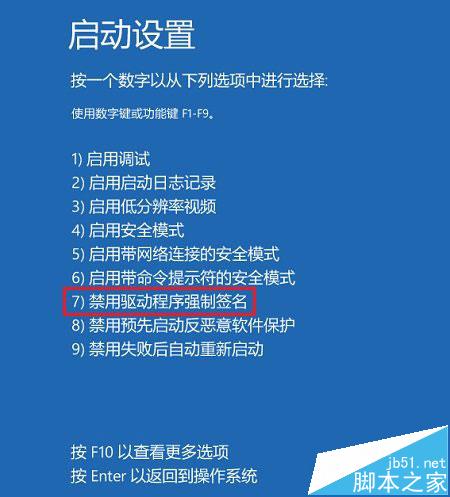 第八步、电脑会再次重启,重启后在启动设置界面,点击“禁用驱动程序强制签名”就可以了!