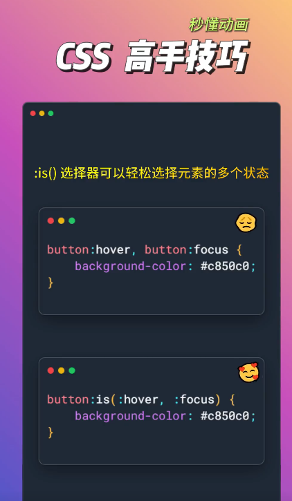 :where() 和 :is() 的不同之处在于,:where() 的优先级总是为 0 ,但是 :is() 的优先级是由它的选择器列表中优先级最高的选择器决定的。