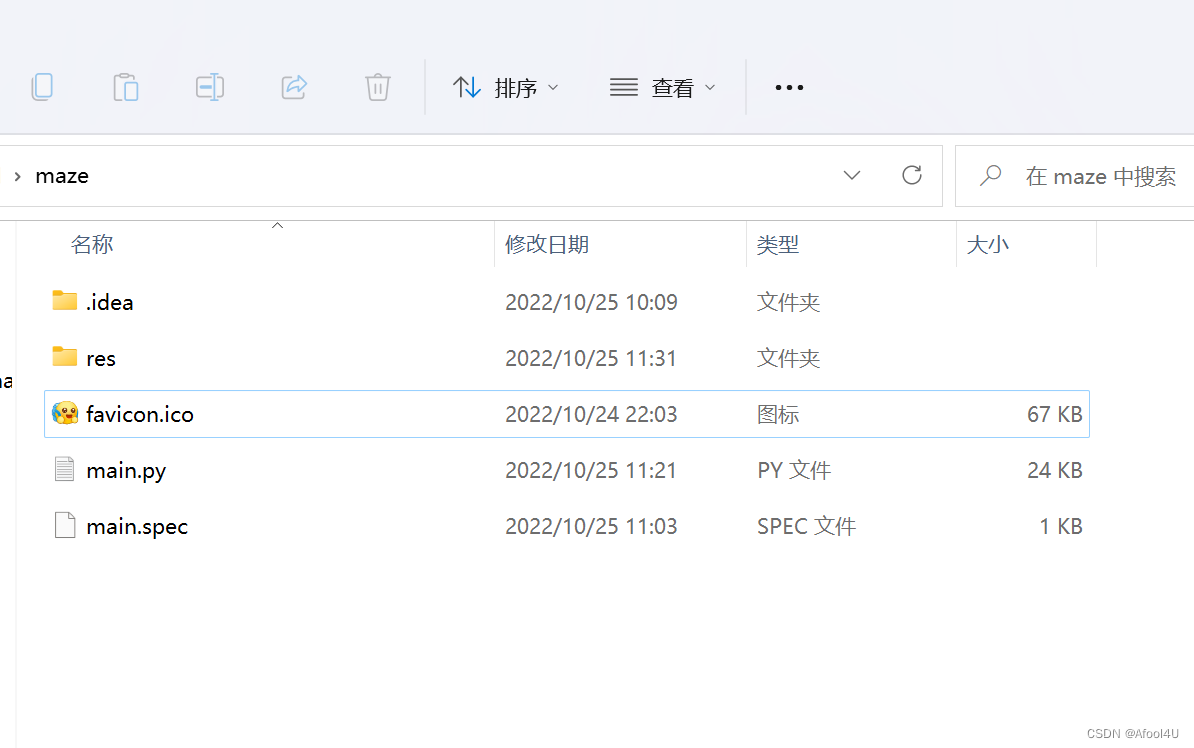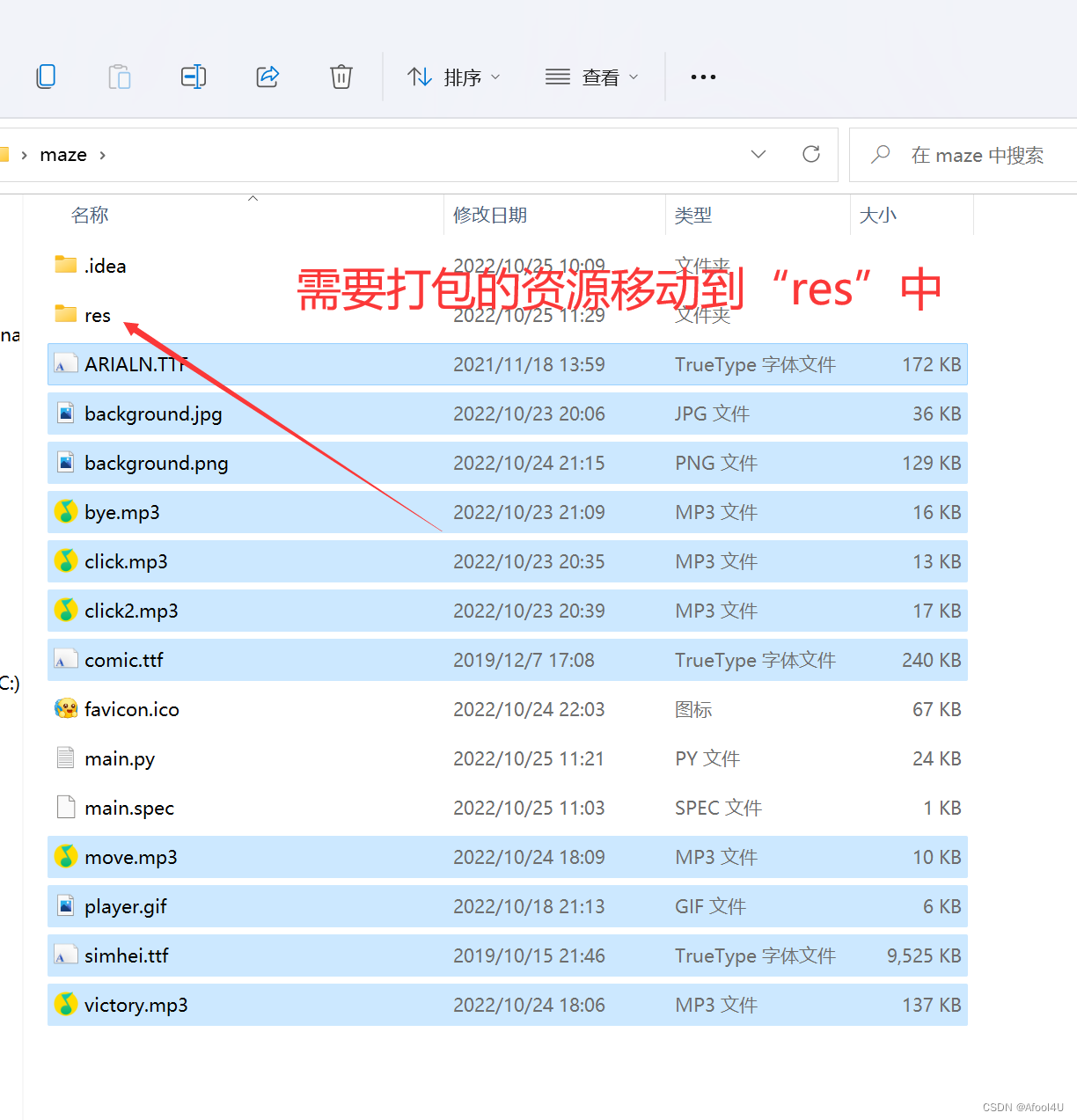 然后创建一个名为“res”的文件夹,将需要打包的资源全部放进去(注意:不需要把程序图标也放进去,“favicon.ico”必须放到“main.py”同级目录,否则在打包时会提示找不到图标文件)