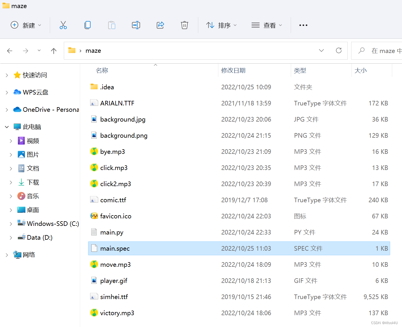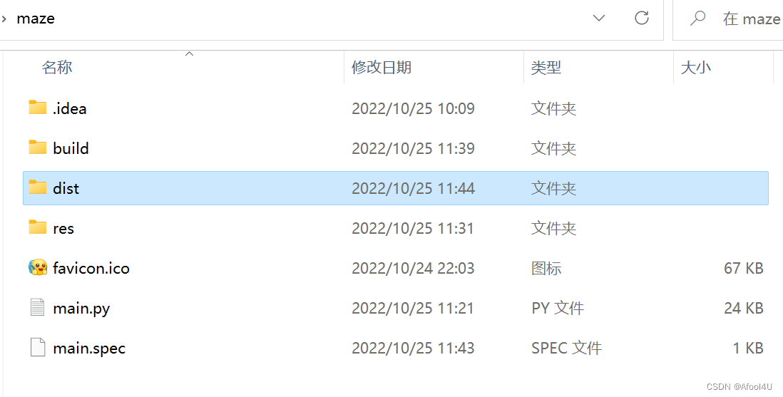 可以看到多出了一个“main.spec”文件(本质上是txt文本文件,可用记事本打开,是实现默认/个性化打包的文件)