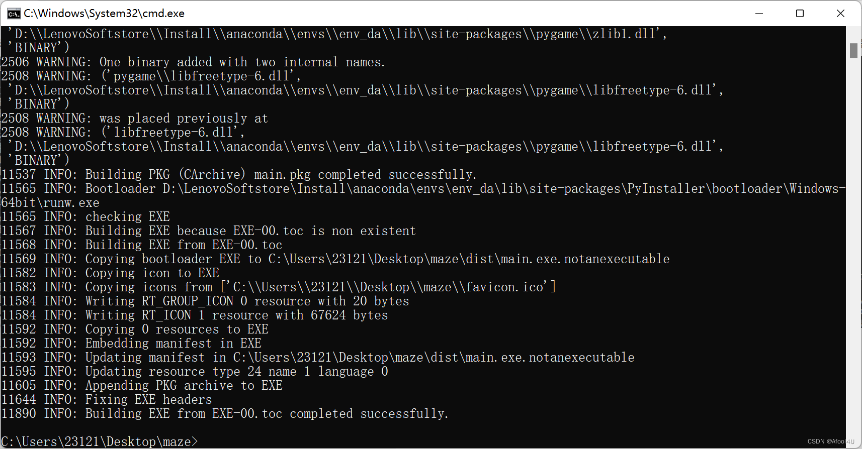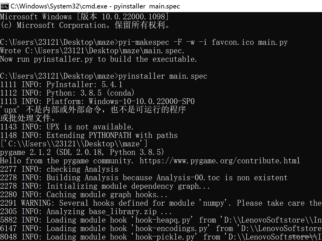 其中“pyi-makespec”会生成一个spec文件(用于指定打包的配置),“-F”效果是打包成一个文件,“-w”则可以使打包后的程序运行时不弹出黑窗口(在打包使用图形界面库的代码,如tkinter、pyqt5、pygame时很有用)。“-i”后跟一个ico格式(其他格式会报错)的图标,则可以指定打包后程序的图标。“main.py”是你要打包程序的入口文件(其他被调用的文件会自动导入)