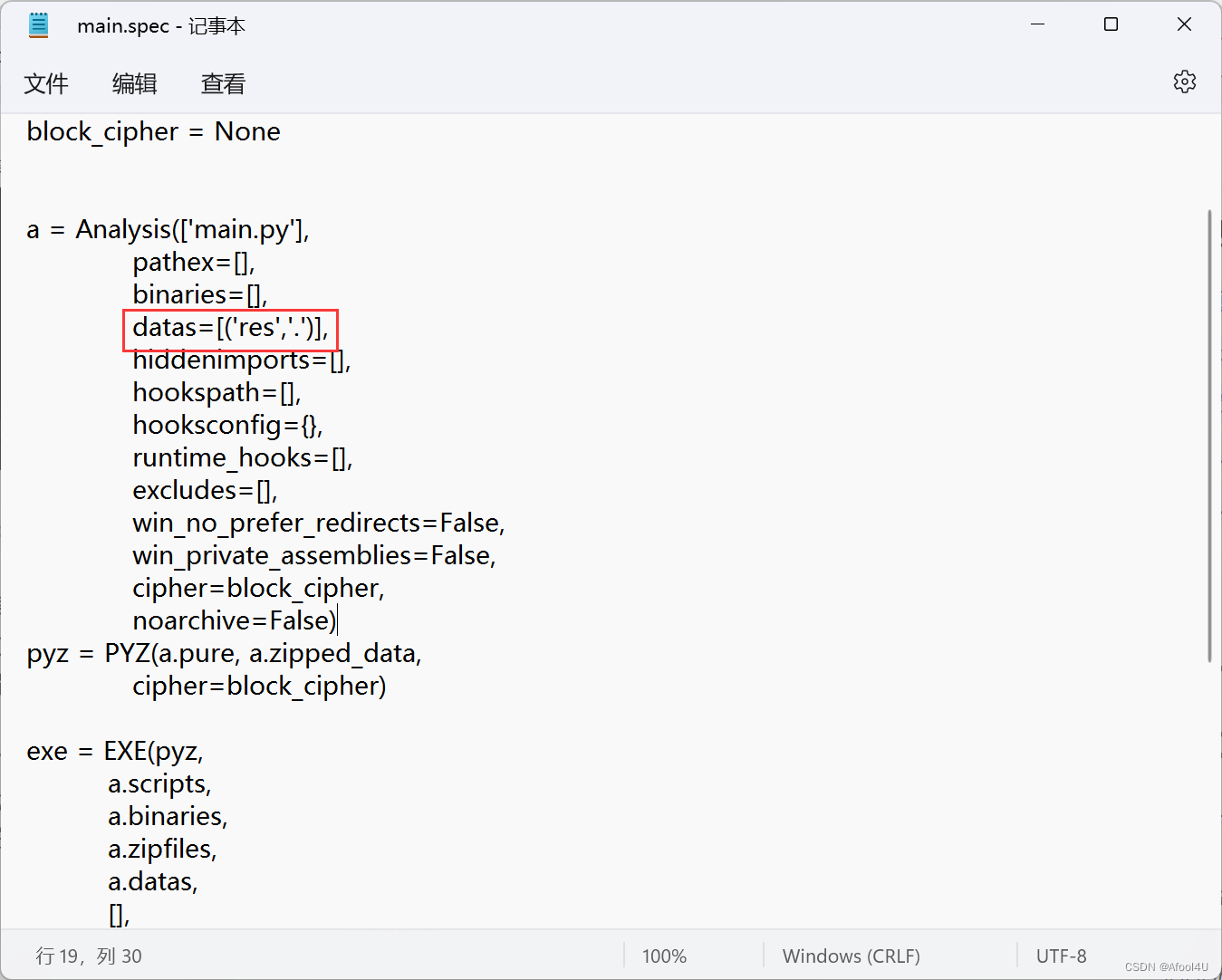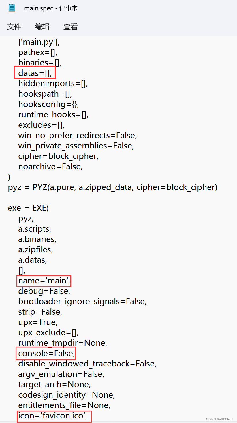可以看到刚刚执行的一些附加条件,如不显示console,设置图标为favcon.ico等。而我们在此问题中需要关注的是“datas=[]”,这里可以指定打包的资源文件。