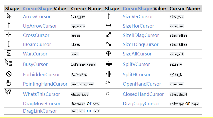 翻译:要设置光标形状,请使用 setShape() 或使用将形状作为参数的 QCursor 构造函数,或者您可以使用 CursorShape 枚举中定义的预定义光标之一。