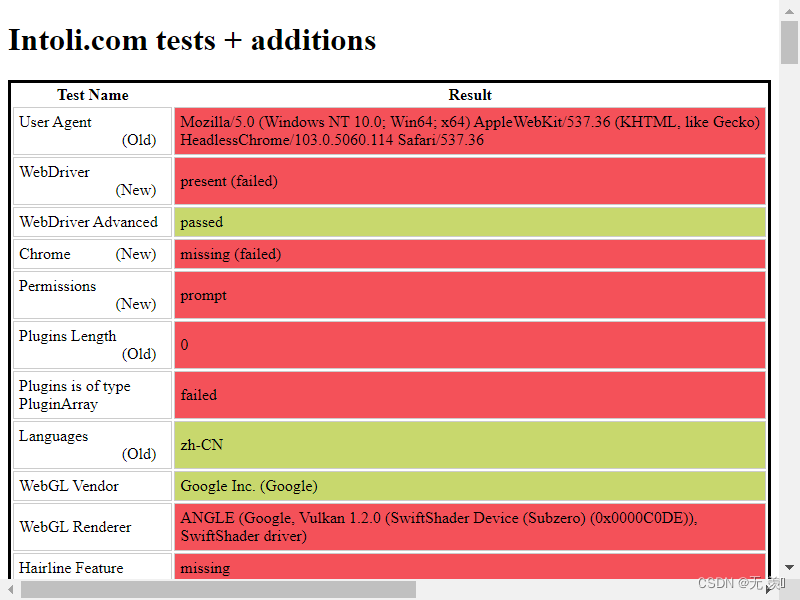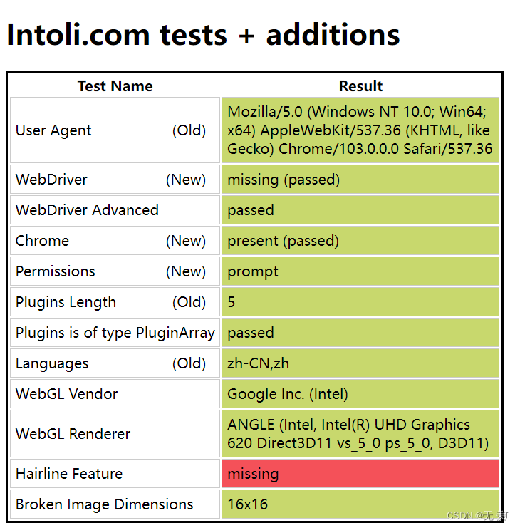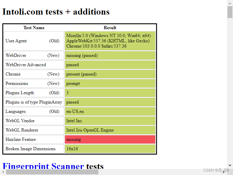 运行结果,可以看到通过执行 stealth.min.js 进行隐藏浏览器指纹,已经和正常访问一样了:
