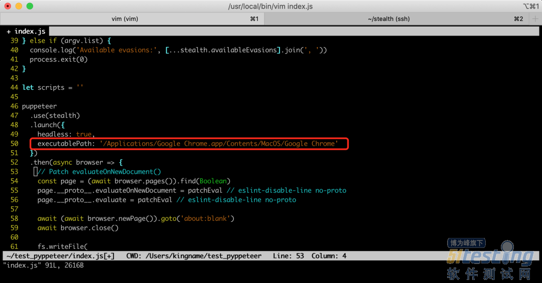 然后修改index.js,给.launch()函数增加一个参数executablePath,指向你电脑上的 Chrome 浏览器,如下图所示: