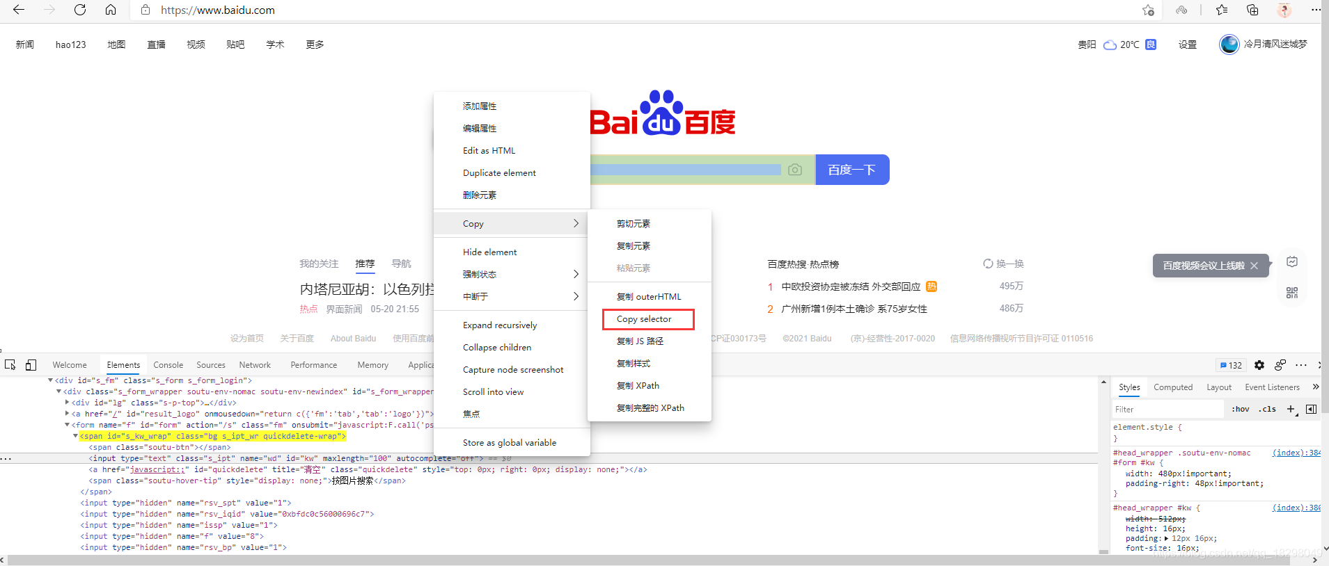 如果不知道CSS定位器怎么写,还可以通过调试时右键元素进行复制CSS定位器,但通过此方法复制的定位器可能很多,很长,需要根据实际需要进行语法优化
