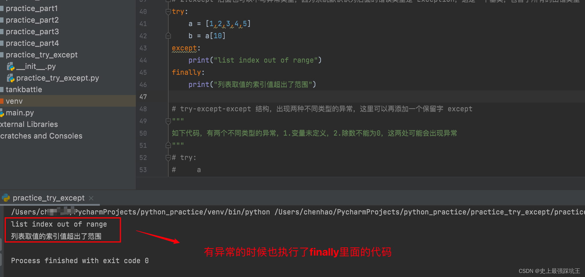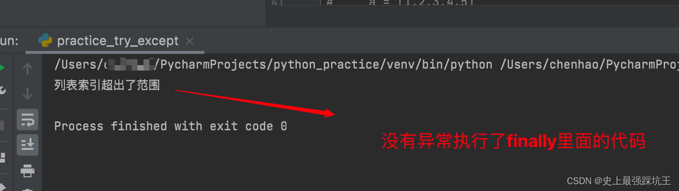 有异常的时候,也执行了 finally 里面的代码,注意,这里使用的是第二种结果,也就是一开始所讲的,except 后面没有跟保留字