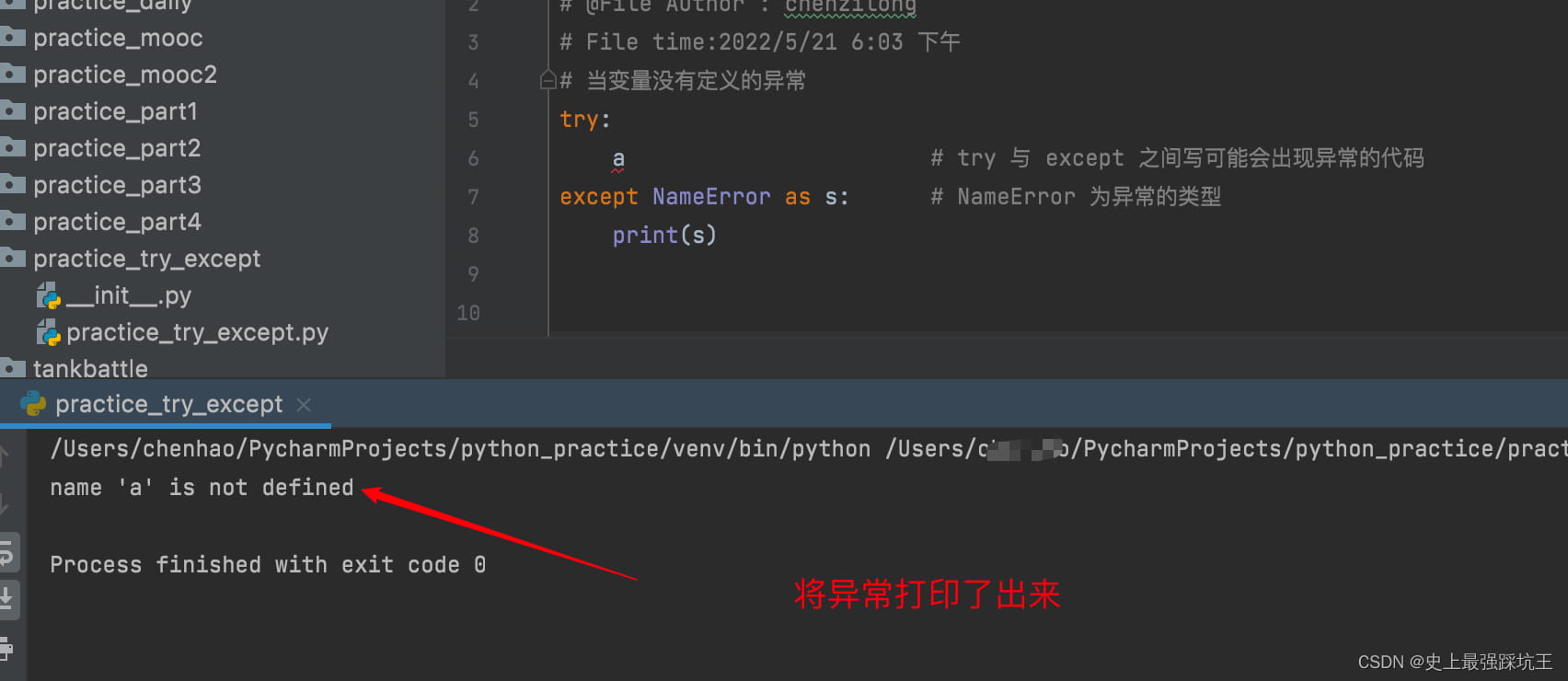 这里不写异常类型和变量,也是可以的,因为 python 解释器内部有一个基类(object),就是异常的基类 Exception ,系统会自动根据你出现的异常类型,去给你打印对应的异常内容