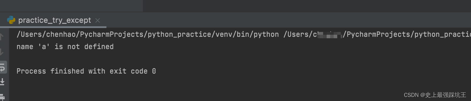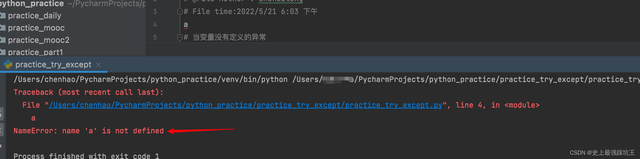 针对于第一种变量没有定义的异常,这里我在 pycharm 中直接输入了一个字母 a,很显然,我没有定义变量 a 然后就去运行就报出了异常