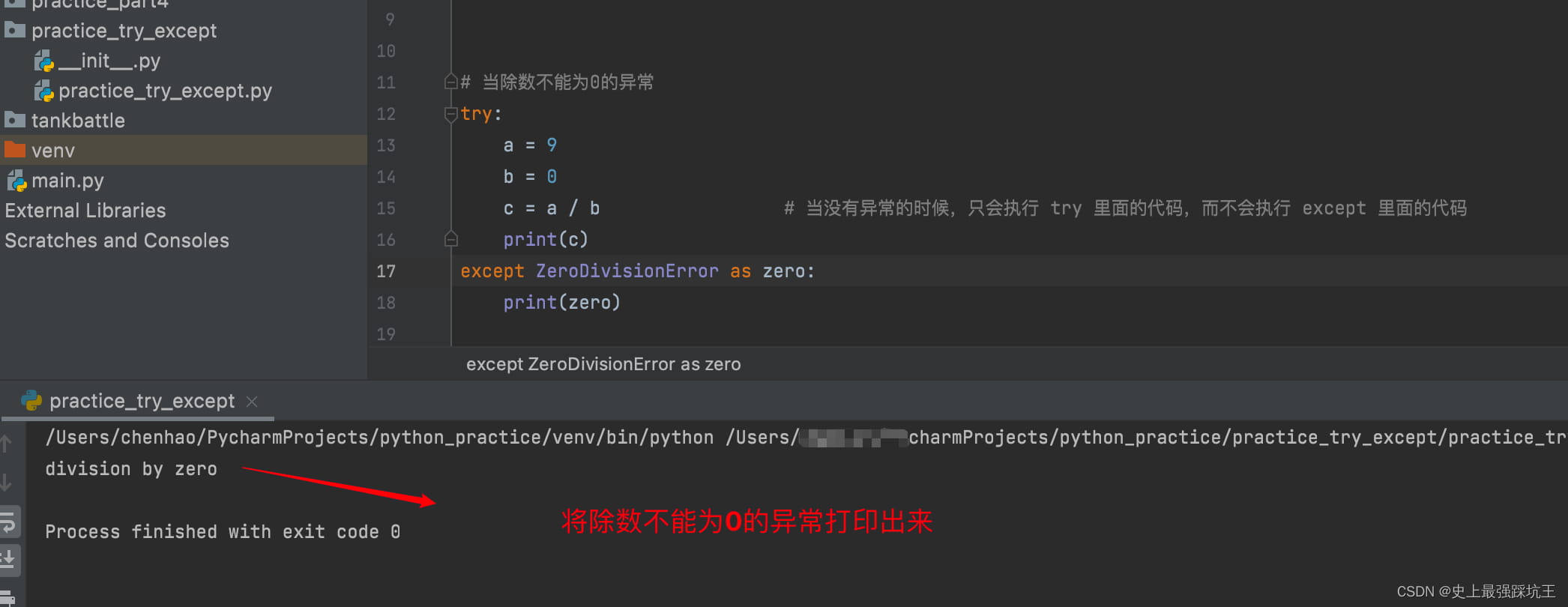 -当除数不为0的时候,这里要理解,当没有异常的时候,只会执行 try 里面你写的正常的代码,而不会去执行 except 里面的代码,所以不必去担心,当我程序运行正常,也会执行 except 里面的代码,而对执行的结果有影响
